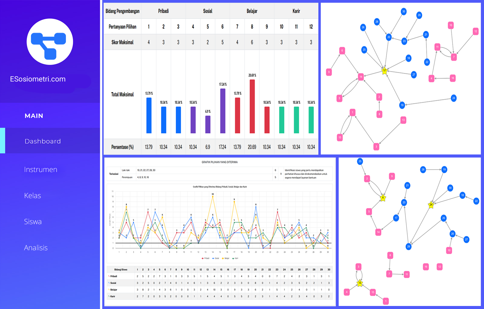 ESosiometri.Com adalah platform digital yang dirancang untuk memudahkan guru dan konselor dalam memetakan hubungan sosial antar siswa di lingkungan sekolah. Dengan sistem yang intuitif dan berbasis web, kami menghadirkan proses pengadministrasian dan pengolahan otomatis yang modern, efisien, dan akurat tanpa perlu lagi menggunakan metode manual yang memakan waktu.